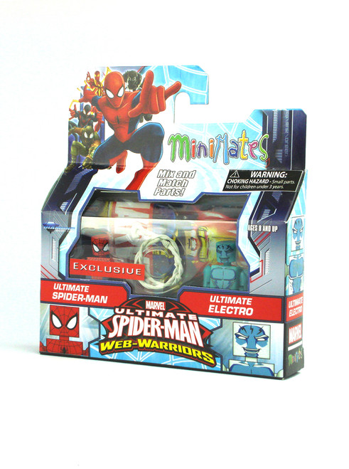 Produced by Art Asylum and Diamond Select in 2015. Featuring Ultimate Spider-Man & Ultimate Electro from the Ultimate Spider-Man Web-Warriors Walgreens 2-Pack Exclusive Series of Marvel Minimates.